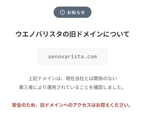 当社が使用していた「ウエノバリスタ」旧ドメインは、現在当社とは無関係の第三者が取得・運用しております。